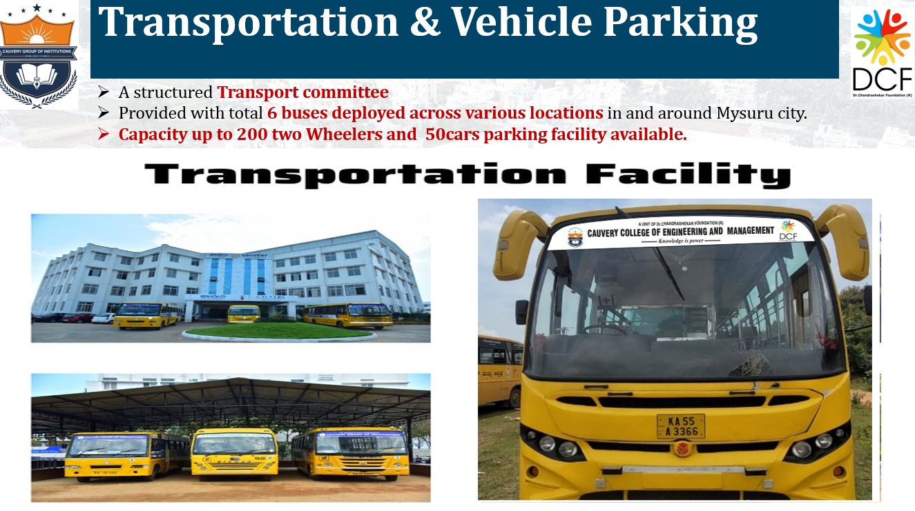 Cauvery College of Engineering offers a safe, reliable, and extensive fleet of buses for student and staff transportation. Our buses ply across numerous routes covering all major parts of the city and its suburbs. The service is designed for punctuality and comfort, ensuring a hassle-free commute. The routes and schedules are meticulously planned and regularly updated to best serve our college community, making the daily journey to the campus convenient and efficient for all.