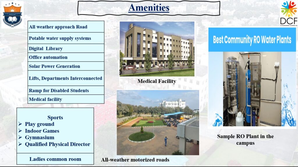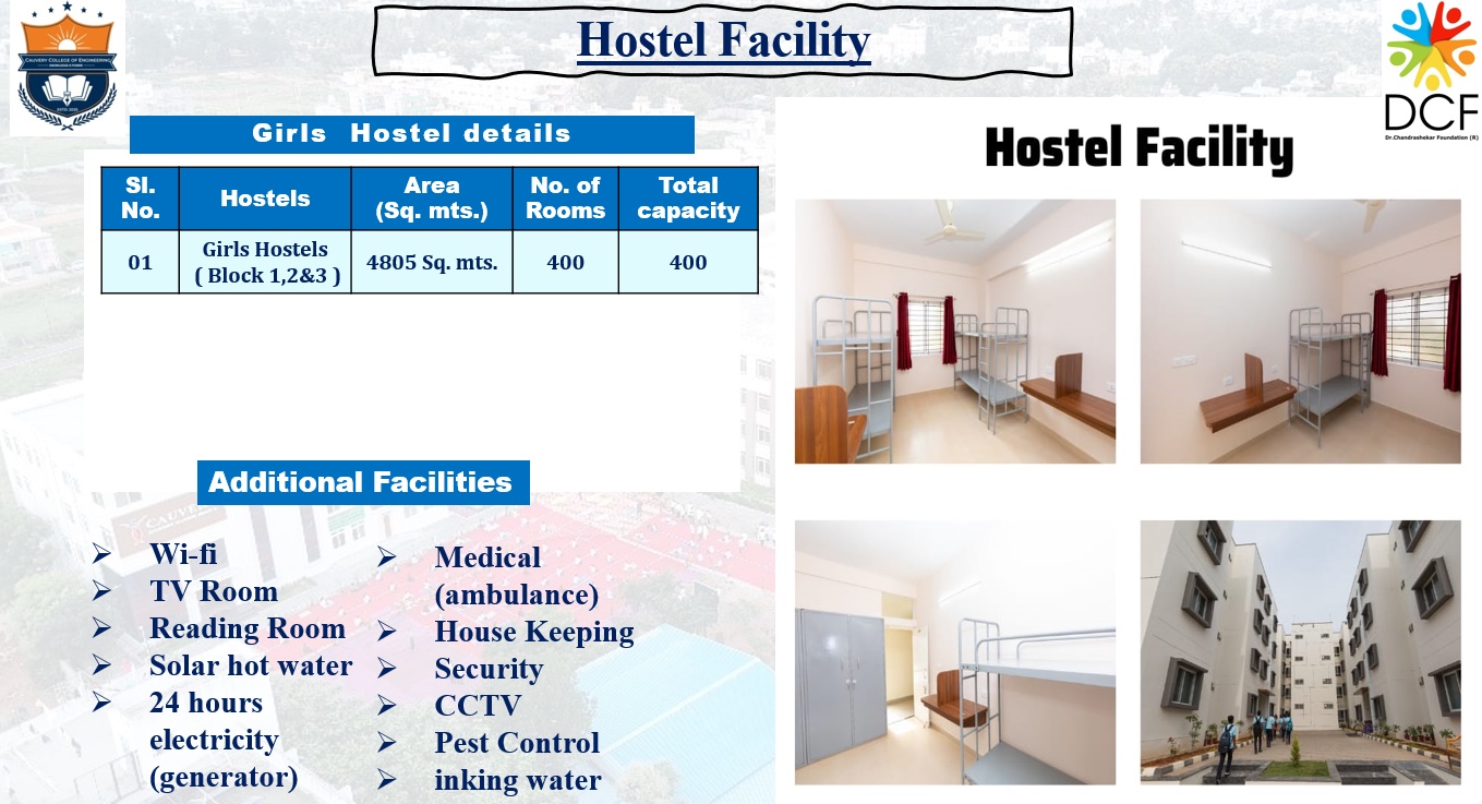 At Cauvery College of Engineering, we believe that a supportive environment is the bedrock of academic excellence. Our campus is meticulously designed with a comprehensive range of amenities to ensure the comfort, well-being, and holistic development of every student. Beyond the classrooms and labs, we provide a nurturing ecosystem that caters to daily needs and fosters a vibrant campus community. From high-speed Wi-Fi connectivity across the campus to a modern healthcare centre, hygienic drinking water facilities, and dedicated spaces for student collaboration, every aspect is curated to make your academic journey seamless and enriching.
